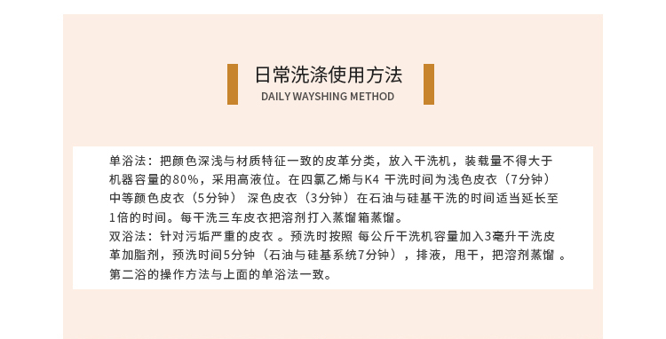 • 產(chǎn)品描述:適用于各種溶劑的干洗系統(tǒng),深入滲透皮革內(nèi)部,使皮革手感柔軟,光滑,有彈性。 加脂的同時(shí)提升清洗效力并有固色功能,提高皮衣顏色的艷度,還原皮衣顏色的深度 提升皮毛的防水功能,減少皮衣穿著時(shí)遇水形成水斑的情況,易于下次清洗保養(yǎng)