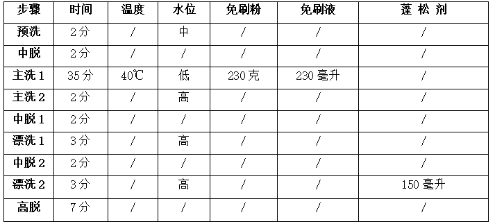 2、主洗:低水位(水位高出滾筒提升筋3厘米,水不能多,正常洗滌時看見有水花從機門的玻璃上滑下就可以),加免刷液230毫升(15毫升/件),免刷粉230克(15克/件),主洗溫度40℃,溫度到達后洗35分鐘(臟污嚴重的可延長5分鐘),再加水至高水位洗2分鐘,降溫后排水,中脫2分鐘。