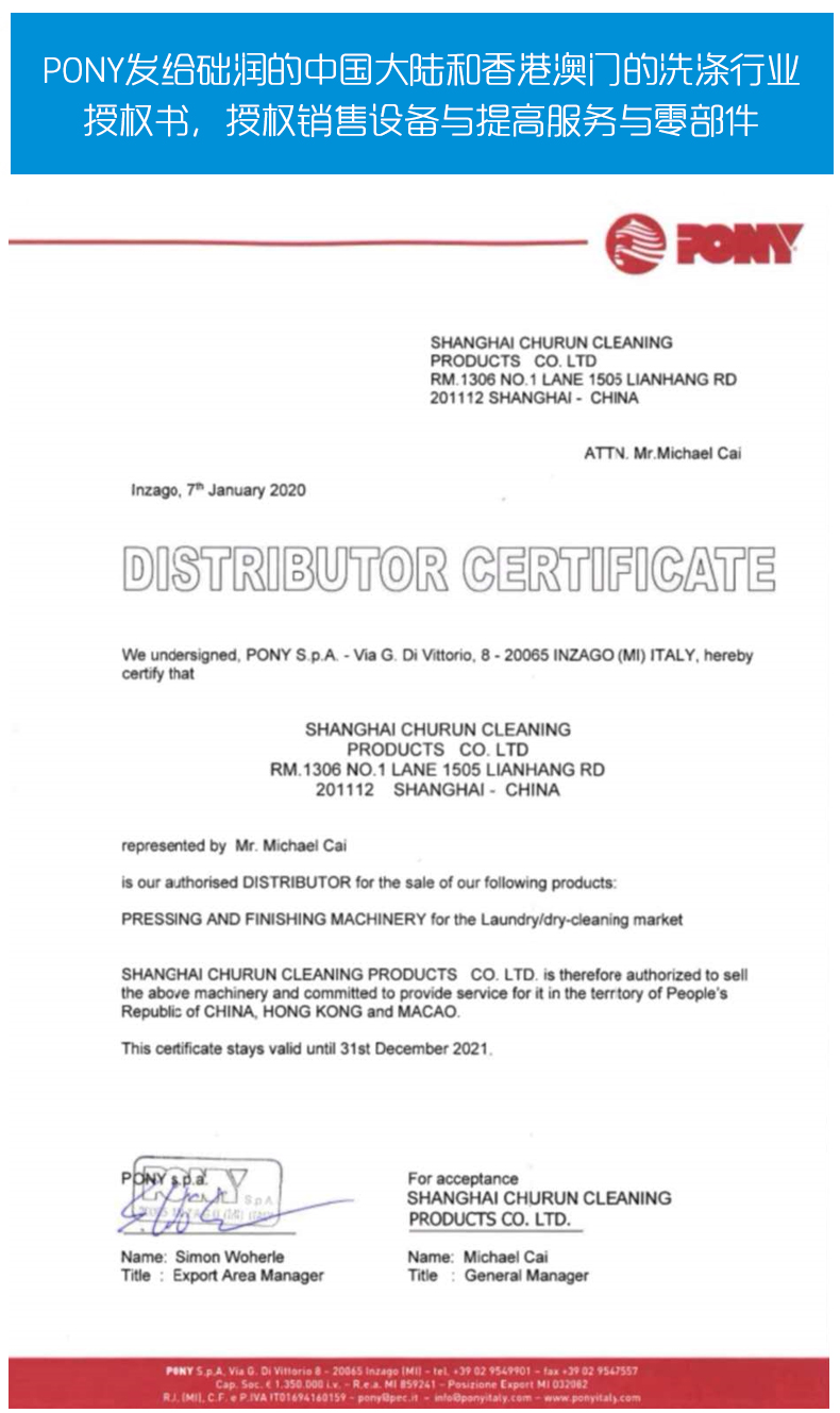 • 意大利最知名的熨燙設(shè)備制造商PONY(鵬尼)和礎(chǔ)潤(rùn)建立牢固的合作關(guān)系,在中國(guó)大陸和香港與澳門銷售PONY的熨燙設(shè)備與提供服務(wù)和原裝零部件,讓中國(guó)數(shù)千家PONY設(shè)備的客戶售后沒有后顧之憂。