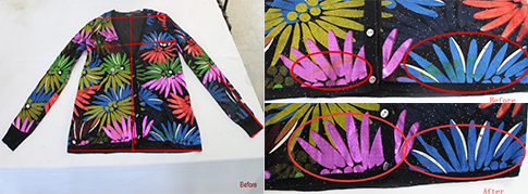 濕洗洗滌結(jié)果:污漬部位洗滌干凈,顏色、手感、風(fēng)格均無變化。